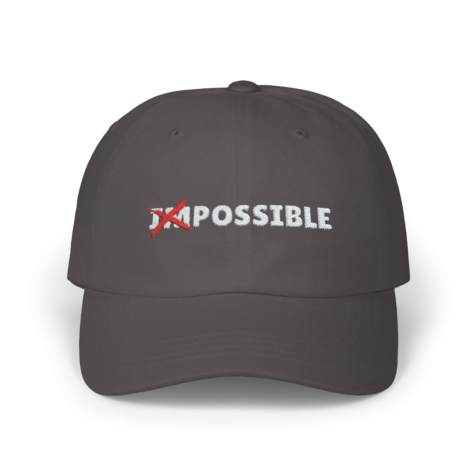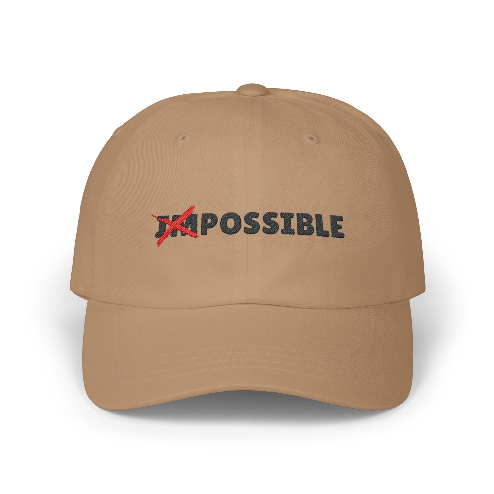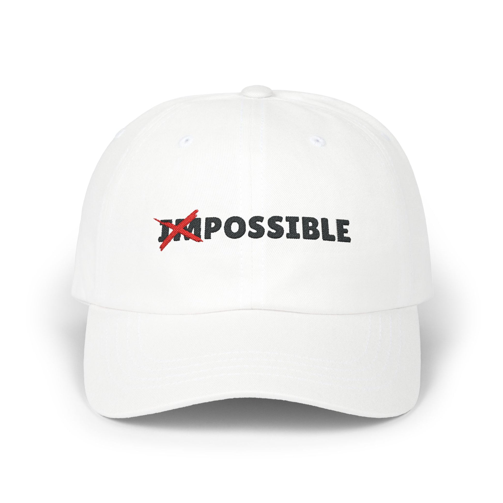 This motivational cap features the word "IMPOSSIBLE" with a red "X" crossing out the "IM" portion, transforming it into "POSSIBLE." It symbolizes overcoming challenges and shifting from negativity to optimism. A perfect accessory for those seeking inspiration and a reminder that anything is possible.