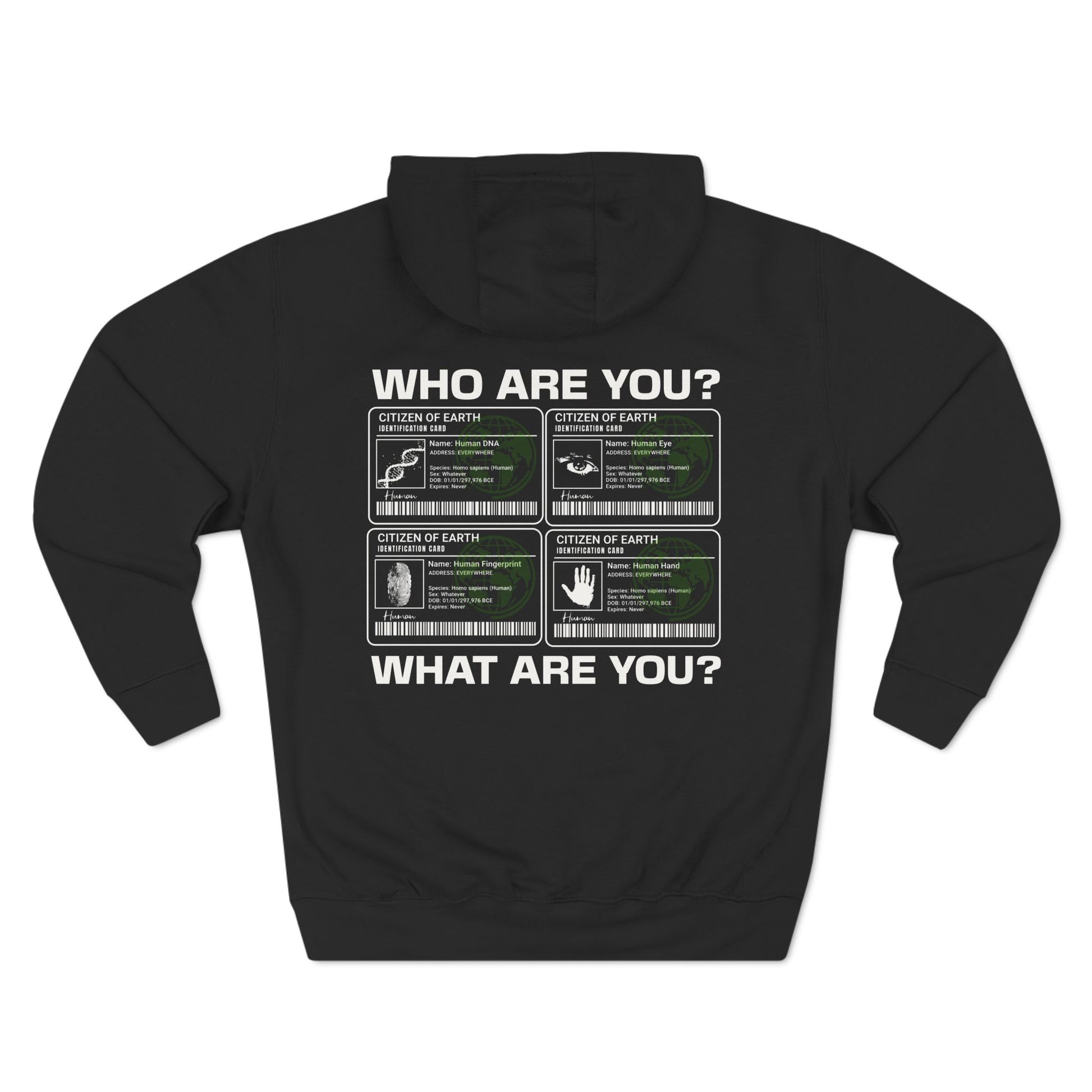 This Citizen of Earth Three-Panel Fleece Hoodie incorporates universal human identifiers like DNA, fingerprints, eyes, and hands into 'Citizen of Earth' ID cards, emphasizing our shared heritage and similarities. It offers a cozy and stylish look, perfect for those who appreciate unity and diversity. Ideal for Earth Day, science enthusiasts, and anyone who values inclusivity.