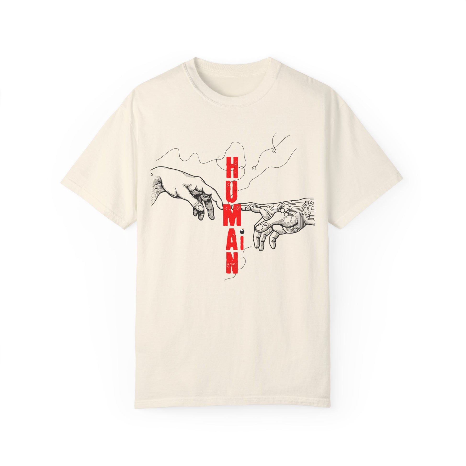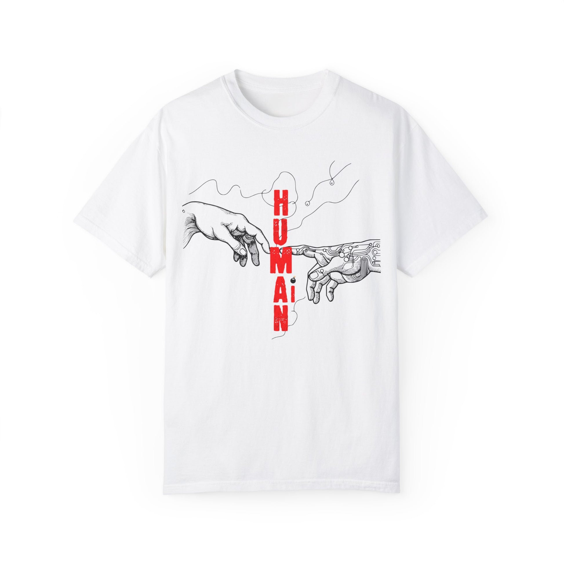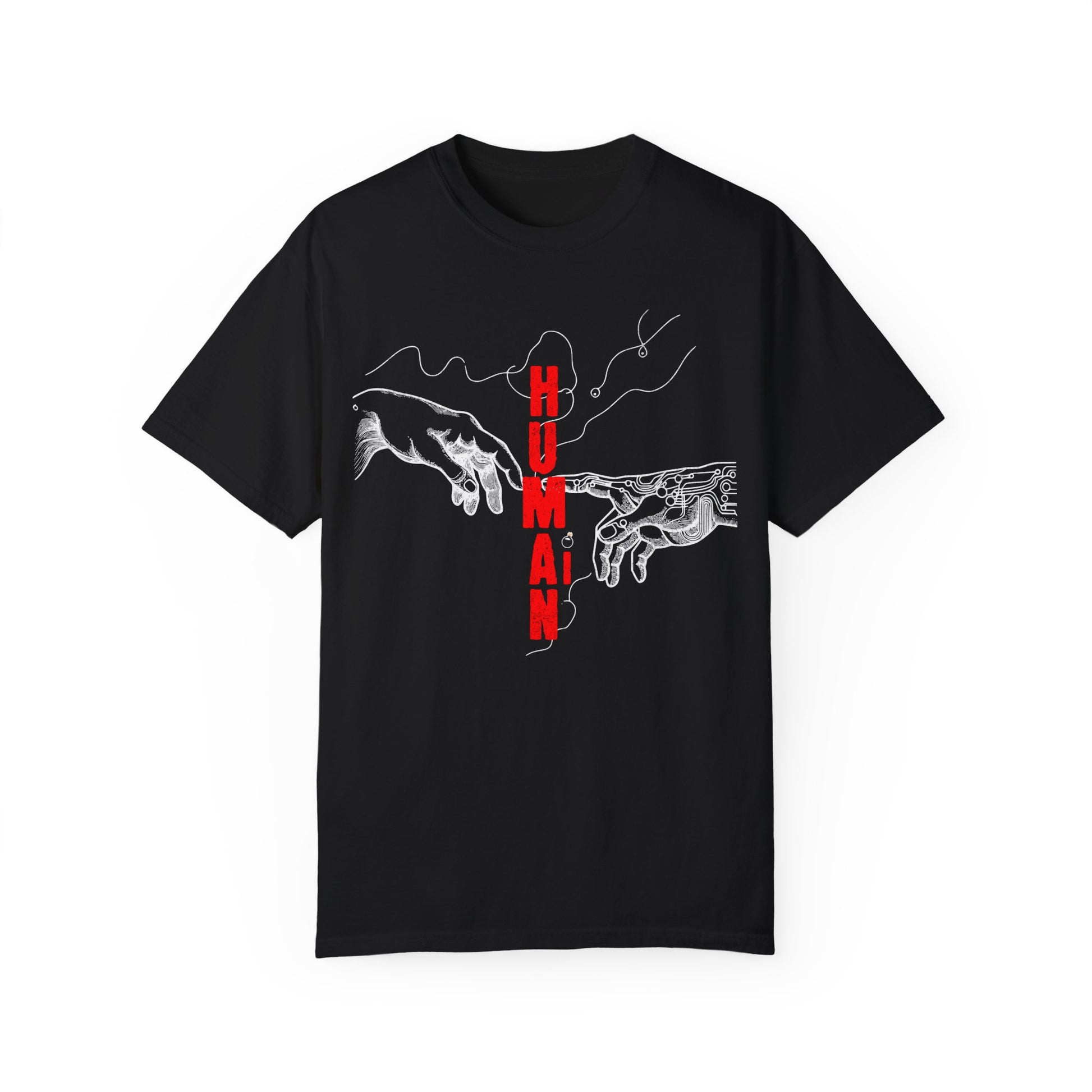 Witness the dawn of a new era with "The Birth of AI" t-shirt from Exploding Imagination! This design reimagines the iconic 'Creation of Adam' to symbolize the groundbreaking emergence of Artificial Intelligence by human hands. The front depicts the critical moment of creation, while the back showcases a blend of human anatomy and AI elements, celebrating the union of biology and technology.